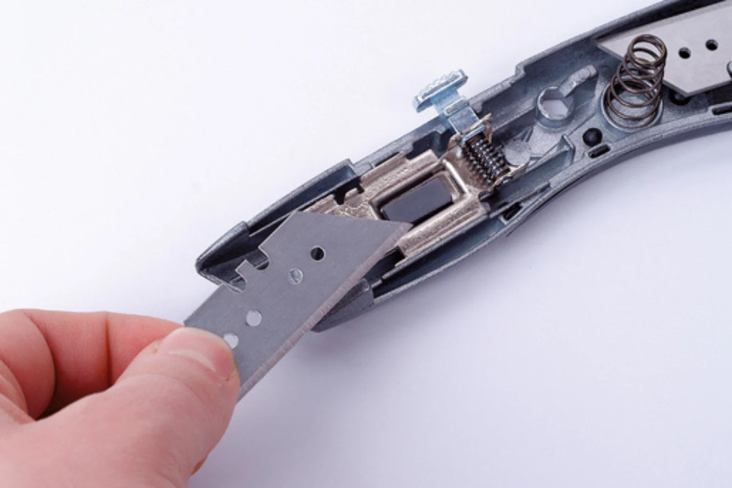Con su carcasa de aluminio, el cúter con cuchilla trapezoidal se adapta cómodamente a la mano. La zona blanda ergonómica facilita el trabajo sin esfuerzo y proporciona un manejo seguro. Cambiar la cuchilla es fácil, sin necesidad de herramientas adicionales. Puedes abrir y cerrar el depósito de cuchillas integrado, que contiene 3 cuchillas de repuesto, con un cierre rápido.