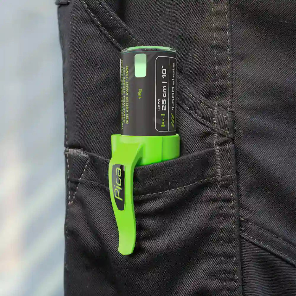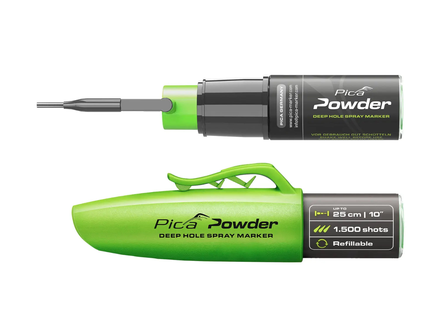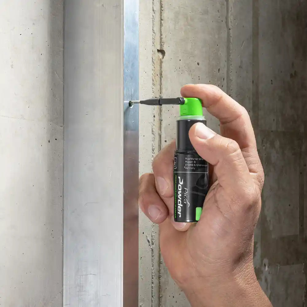 Llega, apunta y marca. El Pica Powder te indica exactamente dónde perforar sin medir ni forzar el ángulo de visión. Su tiza verde fluorescente deja una marca clara, incluso en superficies húmedas o rugosas, para que puedas taladrar de inmediato sin perder tiempo ajustando la posición. Más simple, más limpio, sin pasos extra.