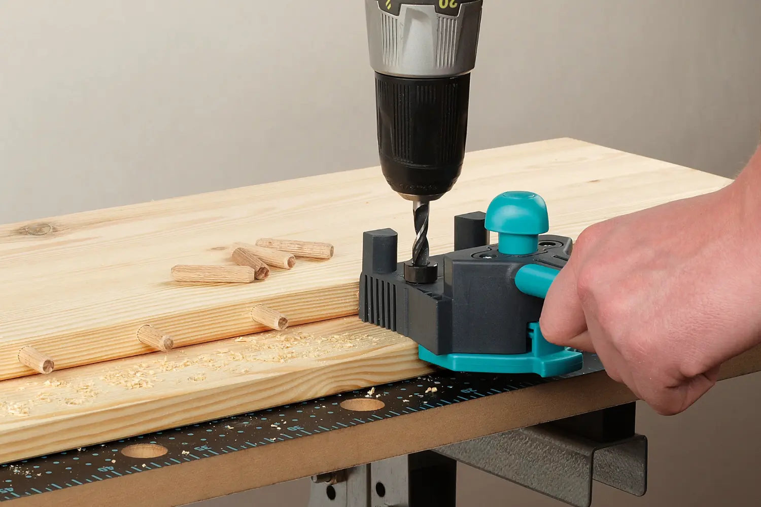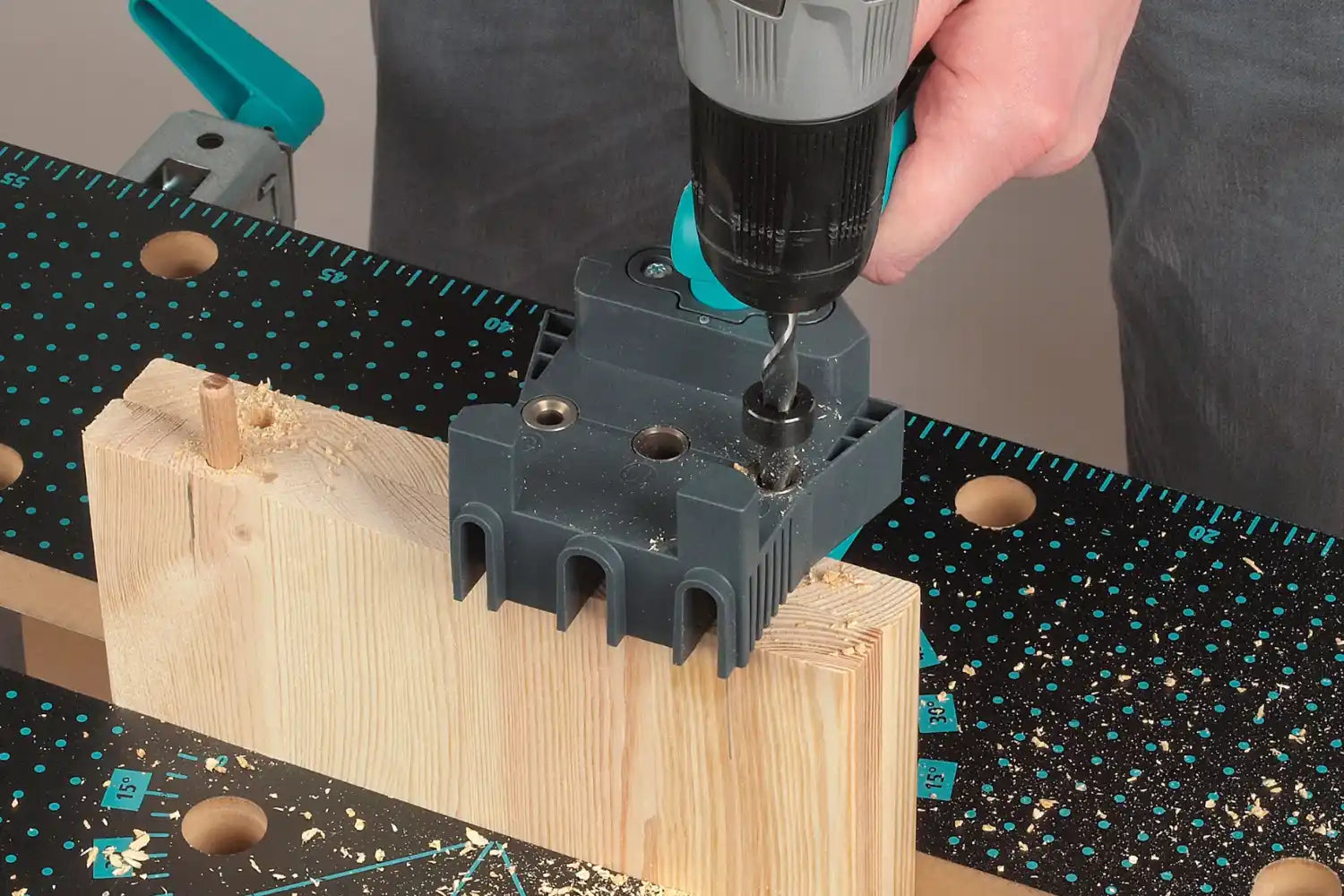 Disfruta de perforaciones perfectamente alineadas, gracias a las tres ranuras-guía en ángulo recto. Los casquillos de acero garantizan que los tarugos se queden en el lugar correcto. Y el tope ajustable te permitirá alinear fácilmente la guía y la pieza de trabajo sin tener que usar herramientas adicionales. ¡Todo lo que necesitas para trabajos profesionales!